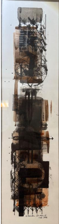 Walzenauftrag, lineare Strukturen, teils farbig laviert (Schwarz-, Braun- und Ockertöne)
