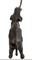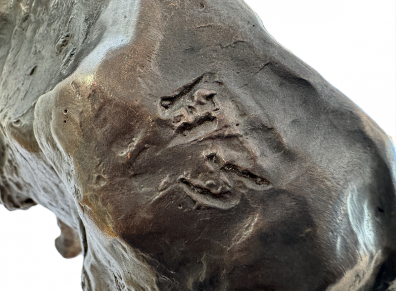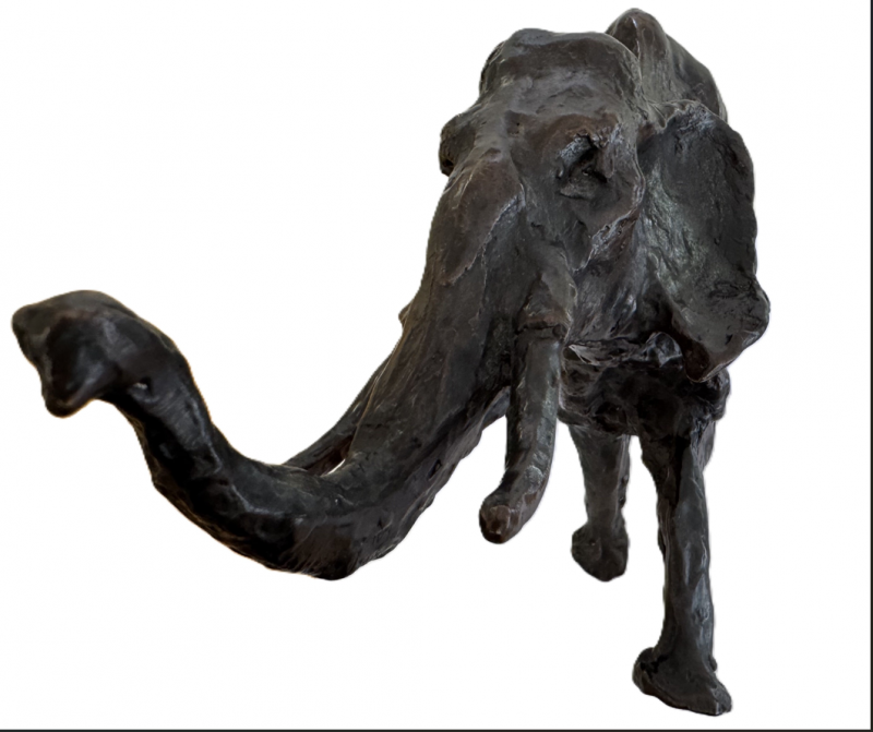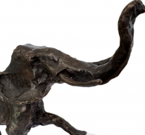Der vorliegende „Elefant“ von Hans Schröder entstand 1977 in Reinbronze als Vollguss. Die Figur zeigt den Elefanten in einer kraftvollen Bewegung mit erhobenem Rüssel, ein Sinnbild für Stärke, Würde und Vitalität. Die Oberfläche ist stark strukturiert, voller Spuren der modellierenden Hand – ein Markenzeichen Schröders, das dem Werk eine lebendige, fast archaische Qualität verleiht. Die Kompaktheit des Körpers, die dynamische Haltung und die raue Patina unterstreichen Schröders Fähigkeit, die Essenz des Tieres einzufangen, ohne sich im Naturalismus zu verlieren. Das Werk zählt zu den gesuchten Tierplastiken aus den 1970er Jahren, in denen Schröder seine Handschrift als Bildhauer gefunden hatte.