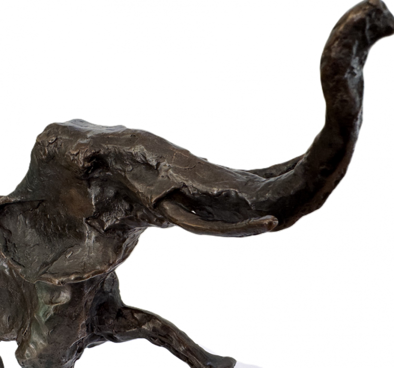 Hans Schröder verstand es, in seinen Bronzeplastiken den Charakter der Tiere durch expressive Oberflächen und kraftvolle Volumina darzustellen. Der „Elefant“ ist in diesem Kontext ein Schlüsselwerk, das in engem Zusammenhang mit seinen Bronzeplastiken „Tiger“ (1977) und „Nashorn“ (1978) steht. Wie bei diesen Arbeiten verzichtet Schröder auf feine Detailtreue zugunsten einer archaischen Ausdrucksqualität. Die raue Bronzehaut verstärkt das Spiel von Licht und Schatten auf der Oberfläche, sodass die Skulptur je nach Blickwinkel neue Facetten offenbart. Mit einer Höhe von 28 cm und einem Gewicht von über 3 kg besitzt das Werk eine beeindruckende Präsenz.