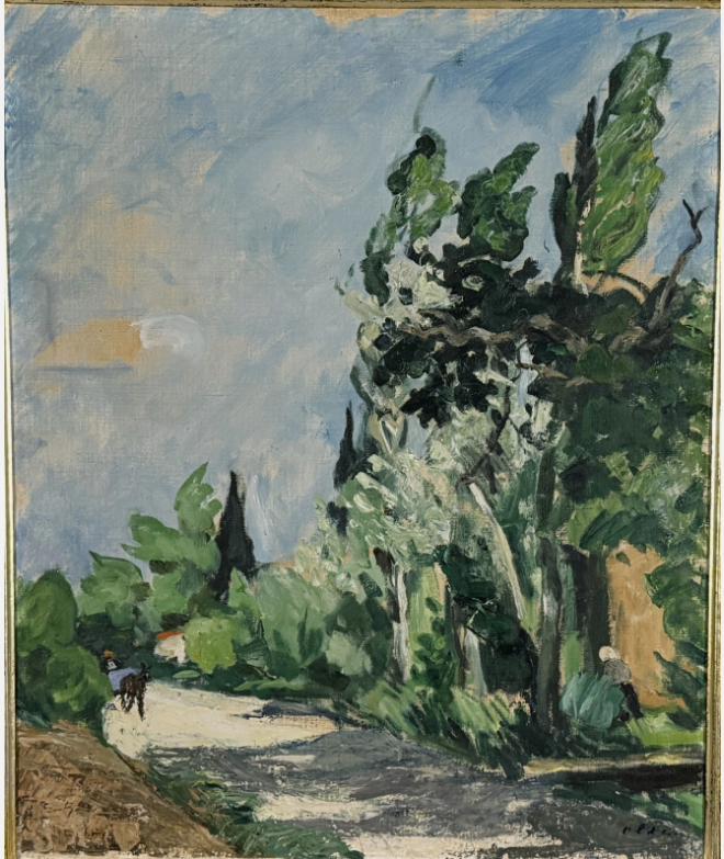 Hans Olde(1895 Gut Seekamp bei Kiel-1987 Gauting )-STRAßE MIT BÄUMEN BEI ORANGE-1926 ÖL/LEI.SIG.