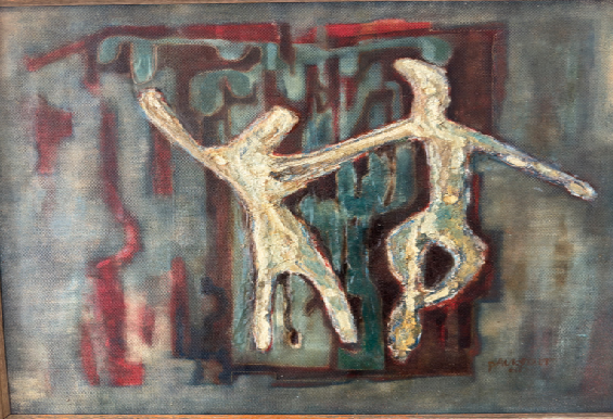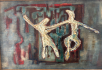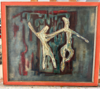 Zustand: Sehr gut. Das Werk zeigt zwei abstrahierte Figuren, die in expressiver Bewegung dargestellt sind vermutlich ein tanzendes Paar. Die Körper sind in stark pastosem, reliefartigem Auftrag gestaltet, sodass eine fast skulpturale Wirkung entsteht. Der Hintergrund ist in kühlen Grün- und Brauntönen angelegt, durchzogen von Rotakzenten, die die Komposition dynamisch beleben. Der Kontrast zwischen den reliefartig hellen Figuren und der dunkleren, atmosphärischen Umgebung verstärkt die symbolische Wirkung von Tanz, Bewegung und Lebendigkeit. Das Bild ist ein Beispiel für die deutsche Nachkriegsmoderne, die in den 1950er/60er-Jahren häufig mit Abstraktion, Materialität und expressiver Figuration experimentierte.
