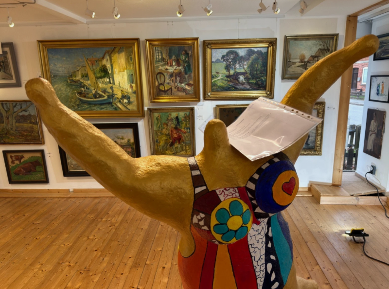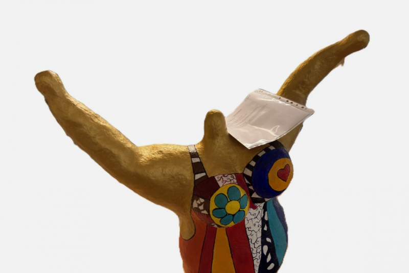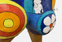 Die kräftigen, kontrastreichen Farben mit dekorativen Mustern sind inspiriert von den Arbeiten Niki de Saint Phalles (1930–2002), ohne jedoch ein Originalwerk der berühmten Künstlerin zu sein.a