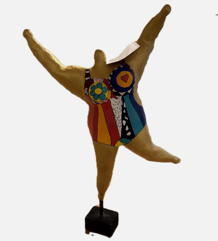 Zustand: Sehr gut – keine sichtbaren Schäden, kräftige Farben, keine Lackabplatzungen Ausführung: Qualitätsvolle, handwerklich präzise Gestaltung mit leuchtender Farbgebung. Beschreibung & Einordnung Die Skulptur zeigt die für die „Nanas“ typischen üppigen, lebensfrohen Körperformen in dynamischer Pose.