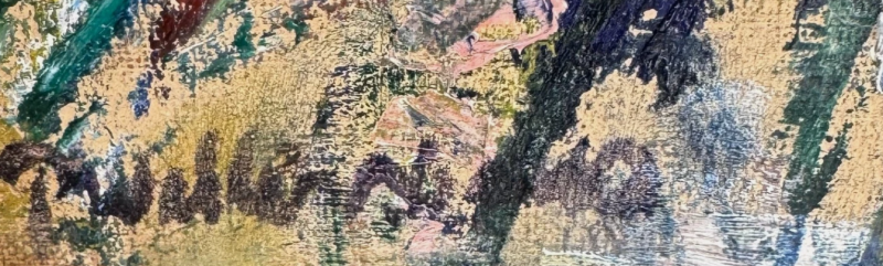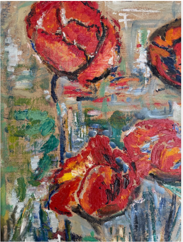 Monumental in Nahsicht komponiertes Blumenstillleben mit fünf leuchtend roten Blütenköpfen. Über einer warmen Grundierung liegen energische Pinsel- und Spachtelzüge in kühlen Grün- und Blautönen; die Malschicht ist reliefartig impasto aufgebaut. Das dominierende Rot wird durch dunkle Akzentstriche gefasst, das Blattwerk bleibt linear-skizzenhaft und rhythmisiert.