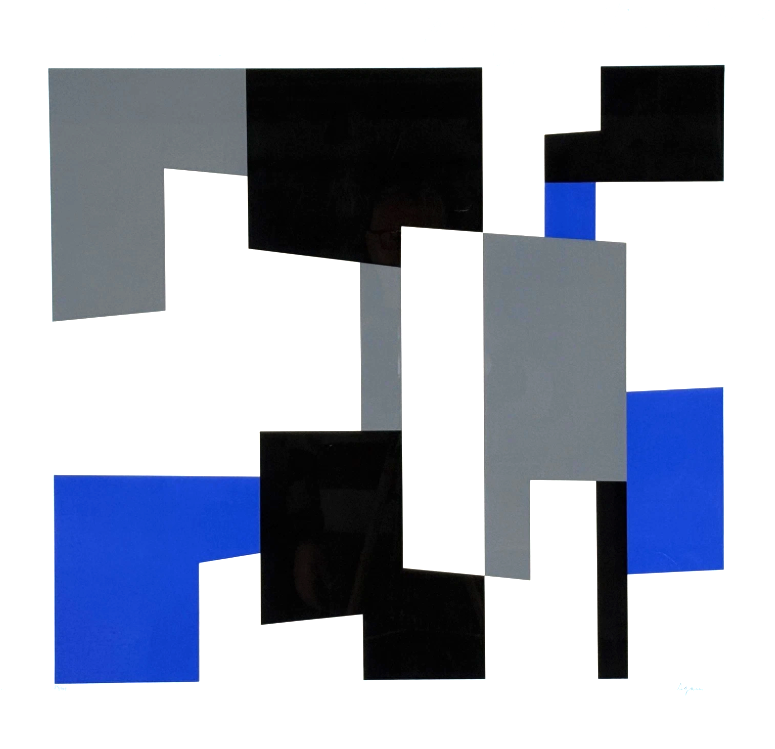 Die kräftigen Ultramarin-Blöcke ('blue five') setzen energetische Akzente in ein Gefüge aus Schwarz, Grau und Weiß. Die Bildordnung ist klar axial, doch durch Versätze, Überdeckungen und geschnittene Kanten entsteht ein visuelles Pulsieren: Das Auge springt – wie bei einem musikalischen Takt – zwischen Hell-Dunkel-Kontrasten und den blauen Einsätzen. Drucktechnik & Oberfläche: