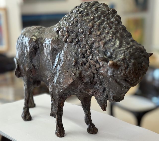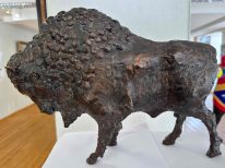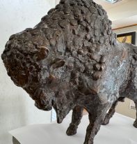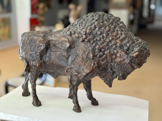 Der monumentale „Wisent“ von Hans Schröder wurde 1976 in Reinbronze als Vollguss geschaffen. Mit einem Gewicht von 6,8 kg zählt er zu den schwersten Tierbronzen des Künstlers in dieser Größenordnung. Die imposante Figur zeigt den Wisent in kraftvoller Haltung, den Kopf leicht gesenkt, die mächtige Schulterpartie hervorgehoben. Die Oberfläche ist stark strukturiert und in dynamischen Formen modelliert, wodurch die Figur urwüchsig und archaisch erscheint.