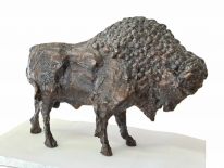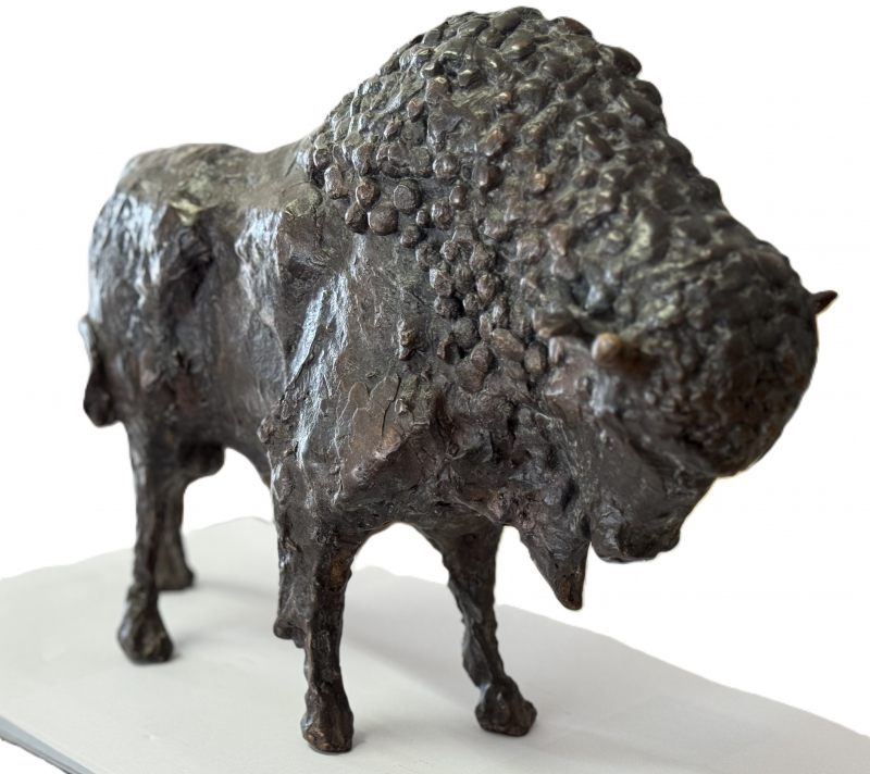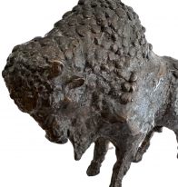 Der monumentale „Wisent“ von Hans Schröder wurde 1976 in Reinbronze als Vollguss geschaffen. Mit einem Gewicht von 6,8 kg zählt er zu den schwersten Tierbronzen des Künstlers in dieser Größenordnung. Die imposante Figur zeigt den Wisent in kraftvoller Haltung, den Kopf leicht gesenkt, die mächtige Schulterpartie hervorgehoben. Die Oberfläche ist stark strukturiert und in dynamischen Formen modelliert, wodurch die Figur urwüchsig und archaisch erscheint.